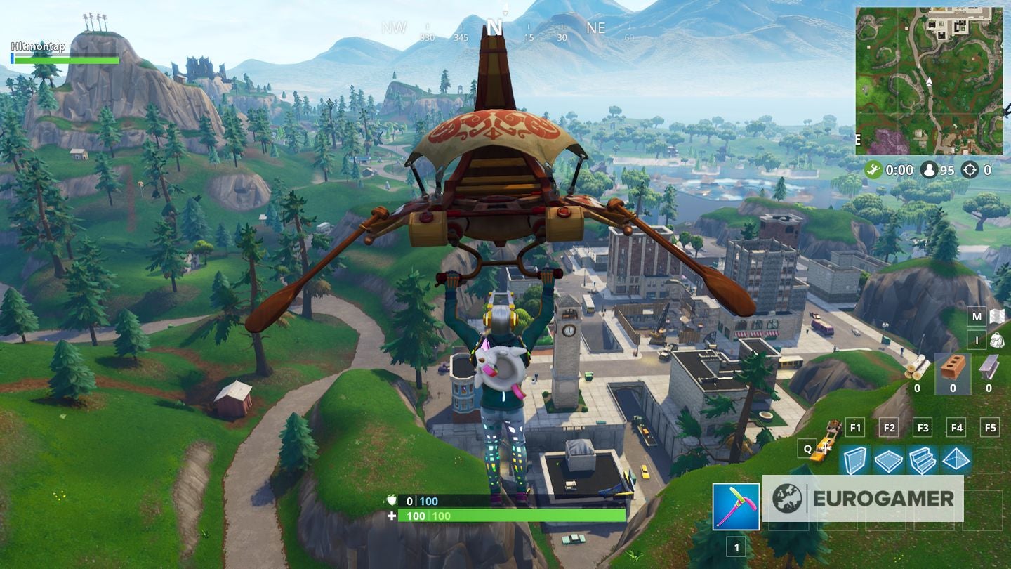 Menara Jam Fortnitite, lokasi porus, lan lokasi tahta porselin lan video: ing ngendi nari ing ndhuwur menara jam, wit jambon, lan tahta porselin buta | Pcgamesn