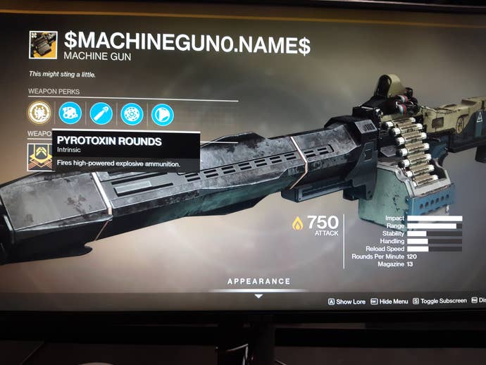 PerK endah: “Kills ngisi majalah kasebut, tambahake kerusakan kanggo durasi cendhak, lan menehi energi super adhedhasar jumlah sing mateni. Fires Full-Auto.”